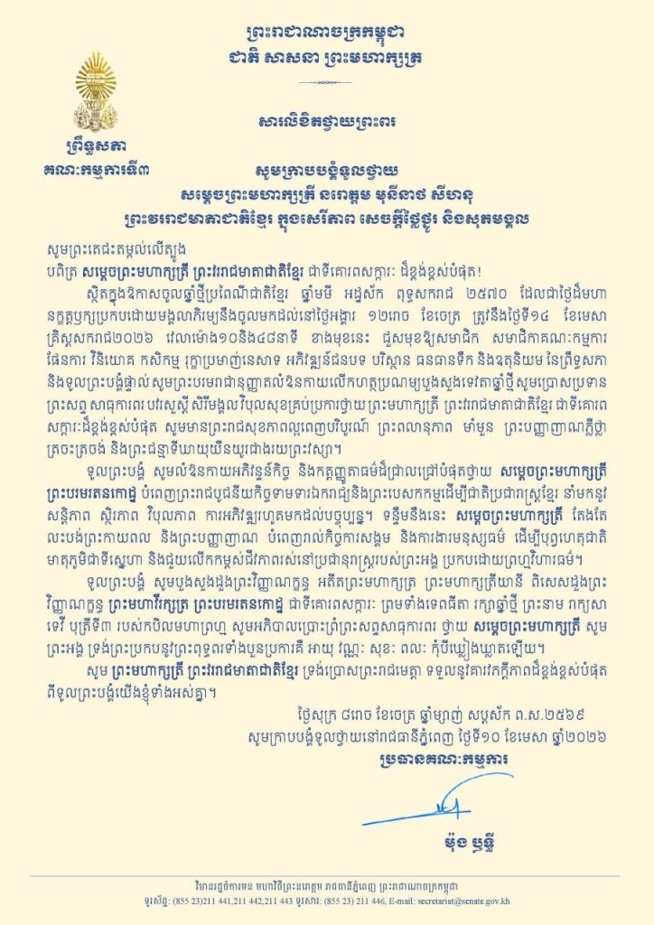 សារលិខិតថ្វាយព្រះពររបស់ឯកឧត្តមបណ្ឌិត ម៉ុង ឫទ្ធី ប្រធានគណៈកម្មការទី៣ព្រឹទ្ធសភា ថ្វាយព្រះពរ សម្តេចព្រះមហាក្សត្រី នរោត្តម មុនីនាថ សីហនុ ព្រះវររាជមាតាជាតិខ្មែរ ក្នុងសេរីភាព សេចក្តីថ្លៃថ្នូរ និងសុភមង្គល ក្នុងឱកាសចូលឆ្នាំថ្មីប្រពៃណីជាតិខ្មែរ ឆ្នាំមមី អដ្ឋស័ក ពុទ្ធសករាជ ២៥៧០ ដែលជាថ្ងៃដ៏មហានក្ខត្តឫក្សប្រកបដោយមង្គលាភិរម្យនឹងចូលមកដល់នៅថ្ងៃអង្គារ ១២រោច ខែចេត្រ ត្រូវនឹងថ្ងៃទី១៤ ខែមេសា គ្រិស្តសករាជ២០២៦ វេលាម៉ោង១០និង៤៨នាទី ខាងមុខនេះ