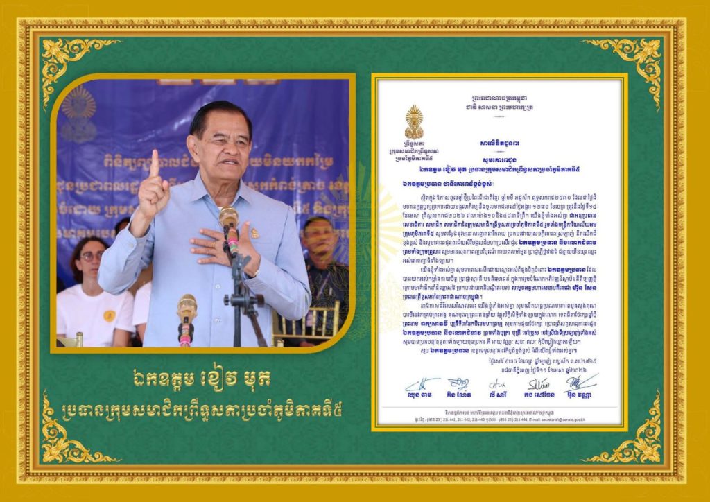 សារលិខិតជូនពររបស់ ឯកឧត្តម អនុប្រធាន ឯកឧត្តម លេខាធិការ ឯកឧត្តម លោកជំទាវ សមាជិក សមាជិកានៃក្រុមសមាជិកព្រឹទ្ធសភាប្រចាំភូមិភាគទី៥ គោរពជូន ឯកឧត្តម ខៀវ មុត ប្រធានក្រុមសមាជិកព្រឹទ្ធសភាប្រចាំភូមិភាគទី៥ ក្នុងឱកាសចូលឆ្នាំប្រពៃណីជាតិខ្មែរ ឆ្នាំមមី អដ្ឋស័ក ព.ស.២៥៧០ ដែលជាថ្ងៃមហានក្ខត្តឫក្សប្រកបដោយមង្គលាភិរម្យនឹងចូលមកដល់នៅថ្ងៃអង្គារ ១២រោច ខែចេត្រ ត្រូវនឹងថ្ងៃទី១៤ ខែមេសា ឆ្នាំ២០២៦ សូម ឯកឧត្តមប្រធាន និងលោកជំទាវ ព្រមទាំងក្រុមគ្រួសារ ទទួលបាននូវពរជ័យសិរីមង្គលដ៏មហាប្រសើរពីទេពធីតាថែរក្សាឆ្នាំថ្មី ព្រះនាម រាក្យសាទវី សូមមានសុខភាពល្អបរិបូរណ៍ កាយពលមាំមួន ប្រាជ្ញាភ្លឺថ្លាវាងវៃ ជន្មានយុយឺនយូរ ឈ្នះអស់រោគាព្យាធិទាំងពួង ព្រមទាំងសមប្រកបនូវពុទ្ធពរទាំងបួនប្រការគឺ អាយុ វណ្ណៈ សុខៈ ពលៈ កុំបីឃ្លៀងឃ្លាតឡើយ