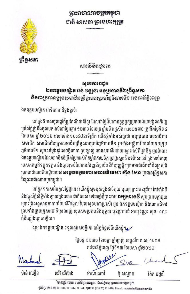 សារលិខិតជូនពររបស់ ឯកឧត្តម លោកជំទាវ សមាជិក សមាជិកាក្រុមសមាជិកព្រឹទ្ធសភាប្រចាំភូមិភាគទី១ គោរពជូន ឯកឧត្តមបណ្ឌិត ធន់ វឌ្ឍនា អនុប្រធានទី២ព្រឹទ្ធសភា និងជាប្រធានក្រុមសមាជិកព្រឹទ្ធសភាប្រចាំភូមិភាគទី១ (រាជធានីភ្នំពេញ) នៅក្នុងឱកាសចូលឆ្នាំថ្មីប្រពៃណីជាតិខ្មែរ ដែលជាថ្ងៃដ៏មហានក្ខត្តឫក្សប្រកបដោយមង្គលាភិរម្យ ប្រពៃថ្លៃថ្លានឹងចូលមកដល់នៅថ្ងៃអង្គារ ១២រោច ខែចេត្រ ឆ្នាំមមី អដ្ឋស័ក ព.ស.២៥៧០ ត្រូវនឹងថ្ងៃទី១៤ ខែមេសា ឆ្នាំ២០២៦ វេលាម៉ោង១០:៤៨នាទីព្រឹក