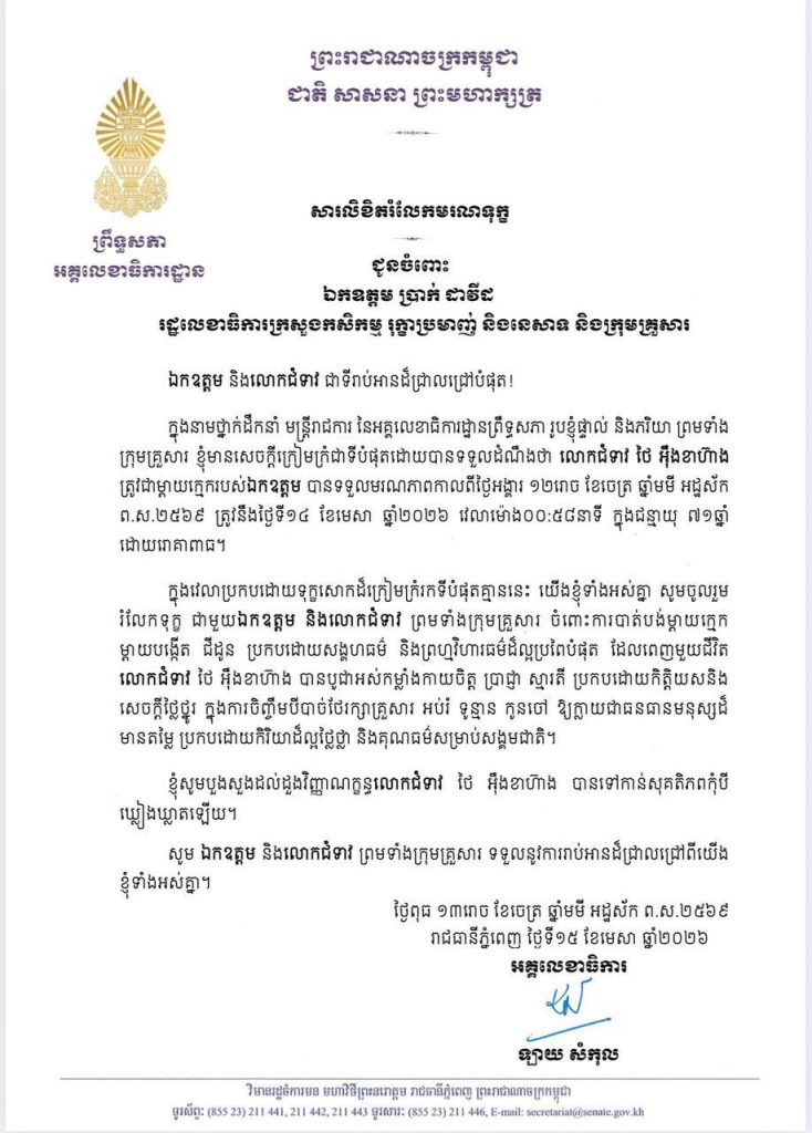 • សារលិខិតរំលែកមរណទុក្ខរបស់ឯកឧត្តម ឡាយ សំកុល អគ្គលេខាធិការព្រឹទ្ធសភា គោរពជូន ឯកឧត្តម ប្រាក់ ដាវីដ រដ្ឋលេខាធិការក្រសួងកសិកម្ម រុក្ខាប្រមាញ់ និងនេសាទ និងក្រុមគ្រួសារ ចំពោះមរណភាព លោកជំទាវ ថៃ អុឹងខាហ៊ាង ត្រូវជាម្តាយក្មេករបស់ឯកឧត្តម ដែលបានទទួលមរណភាព នៅថ្ងៃអង្គារ ទី១៤ ខែមេសា ឆ្នាំ២០២៦ វេលាម៉ោង០០:៥៨នាទីរំលងអធ្រាត្រ ក្នុងជន្មាយុ៧១ឆ្នាំ ដោយរោគាពាធ