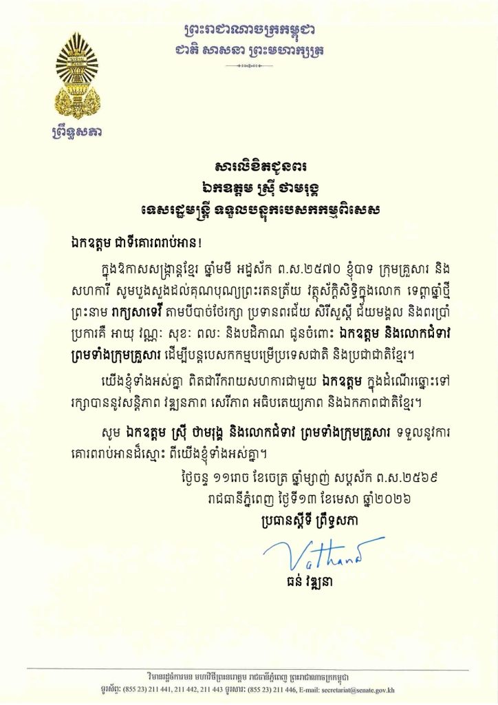 សារលិខិតជូនពររបស់ឯកឧត្តម ឈិត សុខុន ប្រធានគណៈកម្មការទី៧ព្រឹទ្ធសភា គោរពជូន ឯកឧត្តមកិត្តិនីតិកោសលបណ្ឌិត ស៊ឹម កា ឧត្តមប្រឹក្សាផ្ទាល់ព្រះមហាក្សត្រ នៃព្រះរាជាណាចក្រកម្ពុជា ក្នុងឱកាសដ៏មហានក្ខត្តឫក្សឧត្តុង្គឧត្តមថ្លៃថ្លា ប្រកបដោយមង្គលាភិរម្យនៃពិធីចម្រើនជន្មាយុរបស់ ឯកឧត្តមកិត្តិនីតិកោសលបណ្ឌិត ដែលនឹងឈានចូលមកដល់នាថ្ងៃអាទិត្យ ទី១៩ ខែមេសា ឆ្នាំ២០២៦ ខាងមុខនេះ