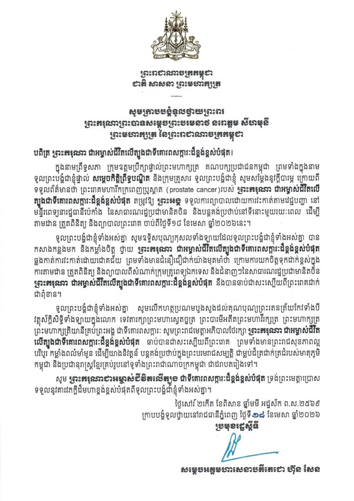 សារលិខិតថ្វាយព្រះពររបស់សម្តេចអគ្គមហាសេនាបតីតេជោ ហ៊ុន សែន ប្រមុខរដ្ឋស្តីទី នៃព្រះរាជាណាចក្រកម្ពុជា ថ្វាយព្រះពរ ព្រះករុណាព្រះបាទសម្តេចព្រះបរមនាថ នរោត្តម សីហមុនី ព្រះមហាក្សត្រ នៃព្រះរាជាណាចក្រកម្ពុជា ក្នុងឱកាស ព្រះអង្គទទួលការព្យាបាលព្រះរោគដោយការវះកាត់តាមវេជ្ជបញ្ជា នៅ មន្ទីរពេទ្យនារដ្ឋធានីប៉េកាំង នៃសាធារណរដ្ឋប្រជាមានិតចិន និងបន្តគង់ប្រថាប់នៅទីនោះមួយរយៈពេល ដើម្បី តាមដាន ត្រួតពិនិត្យ និងព្យាបាលព្រះរោគ ចាប់ពីថ្ងៃទី១៨ ខែមេសា ឆ្នាំ២០២៦នេះ