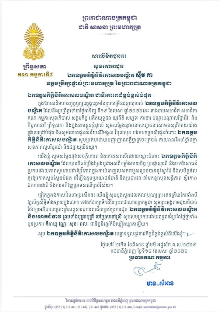 សារលិខិតជូនពររបស់លោកជំទាវ មាន សំអាន ប្រធានគណៈកម្មការទី៨ព្រឹទ្ធសភា គោរពជូន ឯកឧត្តមកិត្តិនីតិកោសលបណ្ឌិត ស៊ឹម កា ឧត្តមប្រឹក្សាផ្ទាល់ព្រះមហាក្សត្រ នៃព្រះរាជាណាចក្រកម្ពុជា ក្នុងឱកាសដ៏មហានក្ខត្តឫក្សឧត្តុង្គឧត្តមនៃខួបចម្រើនជន្មាយុរបស់ ឯកឧត្តមកិត្តិនីតិកោសល បណ្ឌិត ដែលនឹងប្រព្រឹត្តទៅនាថ្ងៃអាទិត្យ ទី១៩ ខែមេសា ឆ្នាំ២០២៦នេះ