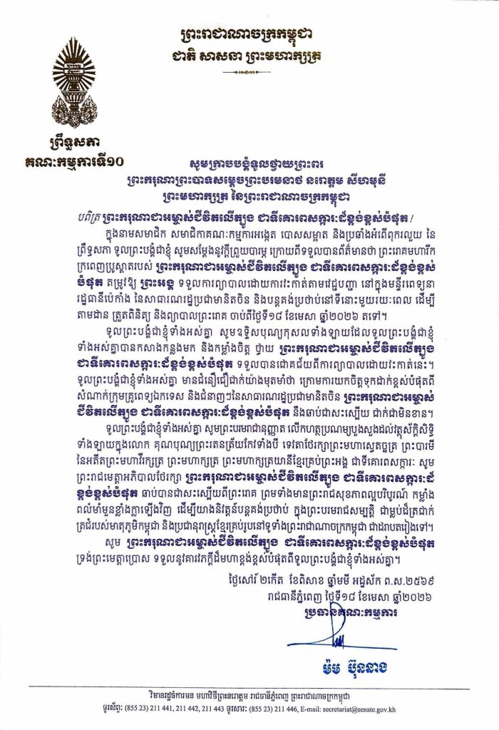 សារលិខិតថ្វាយព្រះពររបស់ឯកឧត្តម ម៉ម ប៊ុននាង ប្រធានគណៈកម្មការទី១០ព្រឹទ្ធសភា ថ្វាយព្រះពរ ព្រះករុណាព្រះបាទសម្តេចព្រះបរមនាថ នរោត្តម សីហមុនី ព្រះមហាក្សត្រ នៃព្រះរាជាណាចក្រកម្ពុជា ក្រោយពីទទួលបានព័ត៌មានថា ព្រះរោគមហារីក ក្រពេញប្រូស្តាតរបស់ ព្រះករុណាជាអម្ចាស់ជីវិតលើត្បូង ជាទីគោរពសក្ការៈដ៏ខ្ពង់ខ្ពស់បំផុត តម្រូវឱ្យព្រះអង្គ ទទួលការព្យាបាលដោយការវះកាត់តាមវេជ្ជបញ្ជា នៅក្នុងមន្ទីរពេទ្យនារដ្ឋធានីប៉េកាំង នៃសាធារណរដ្ឋប្រជាមានិតចិន និងបន្តគង់ប្រថាប់នៅទីនោះមួយរយៈពេល ដើម្បីតាមដាន ត្រួតពិនិត្យ និងព្យាបាលព្រះរោគ ចាប់ពីថ្ងៃទី១៨ ខែមេសា ឆ្នាំ២០២៦ តទៅ