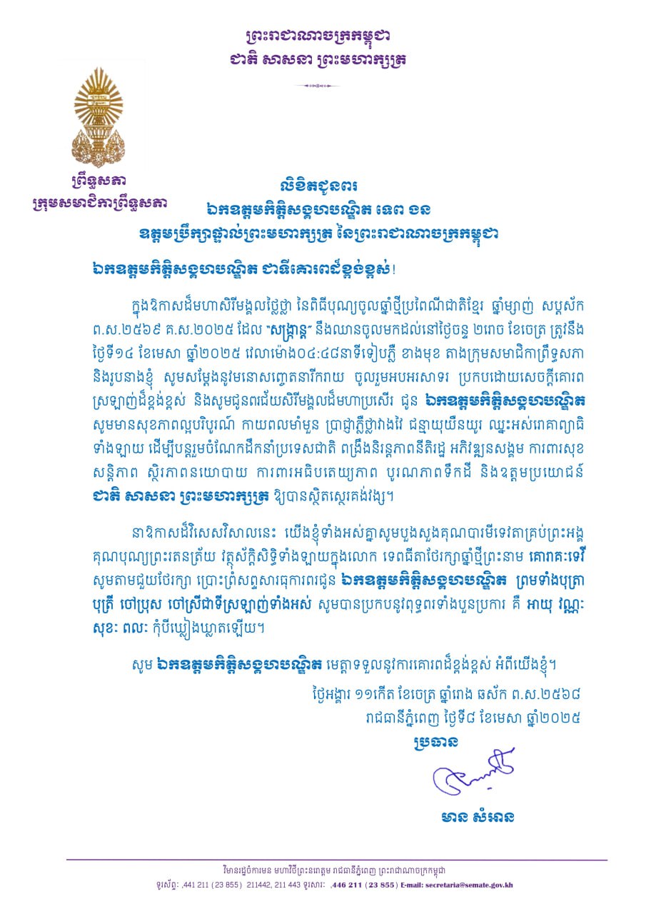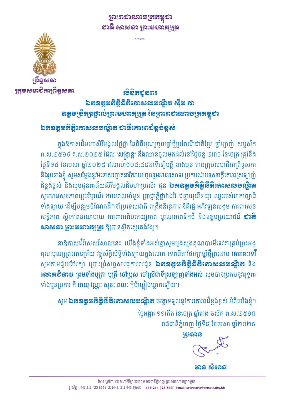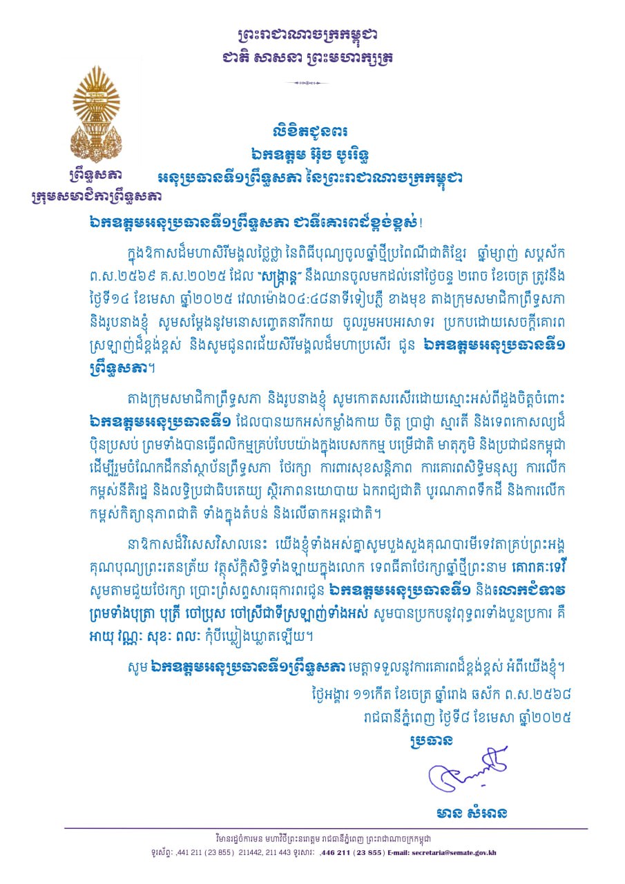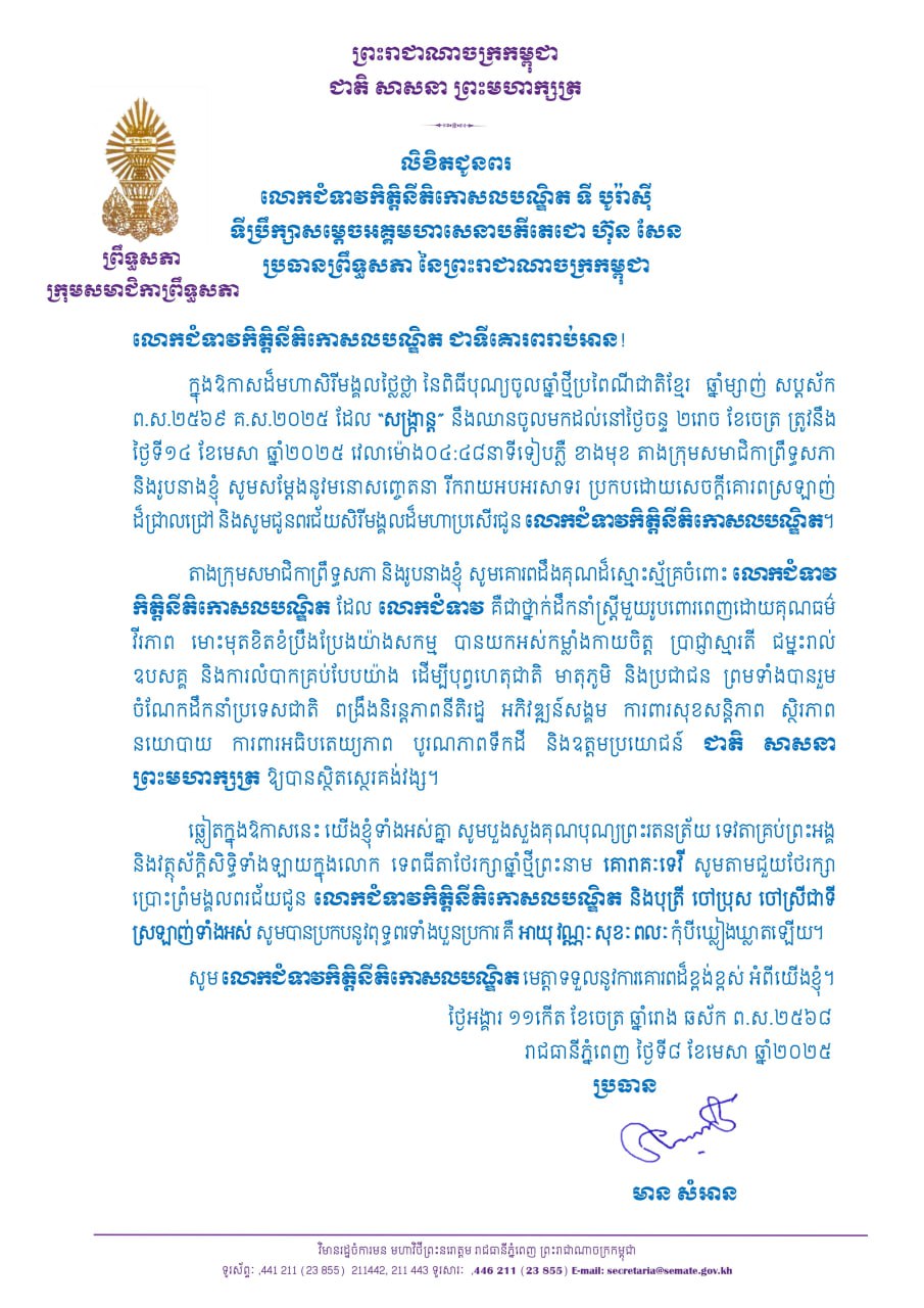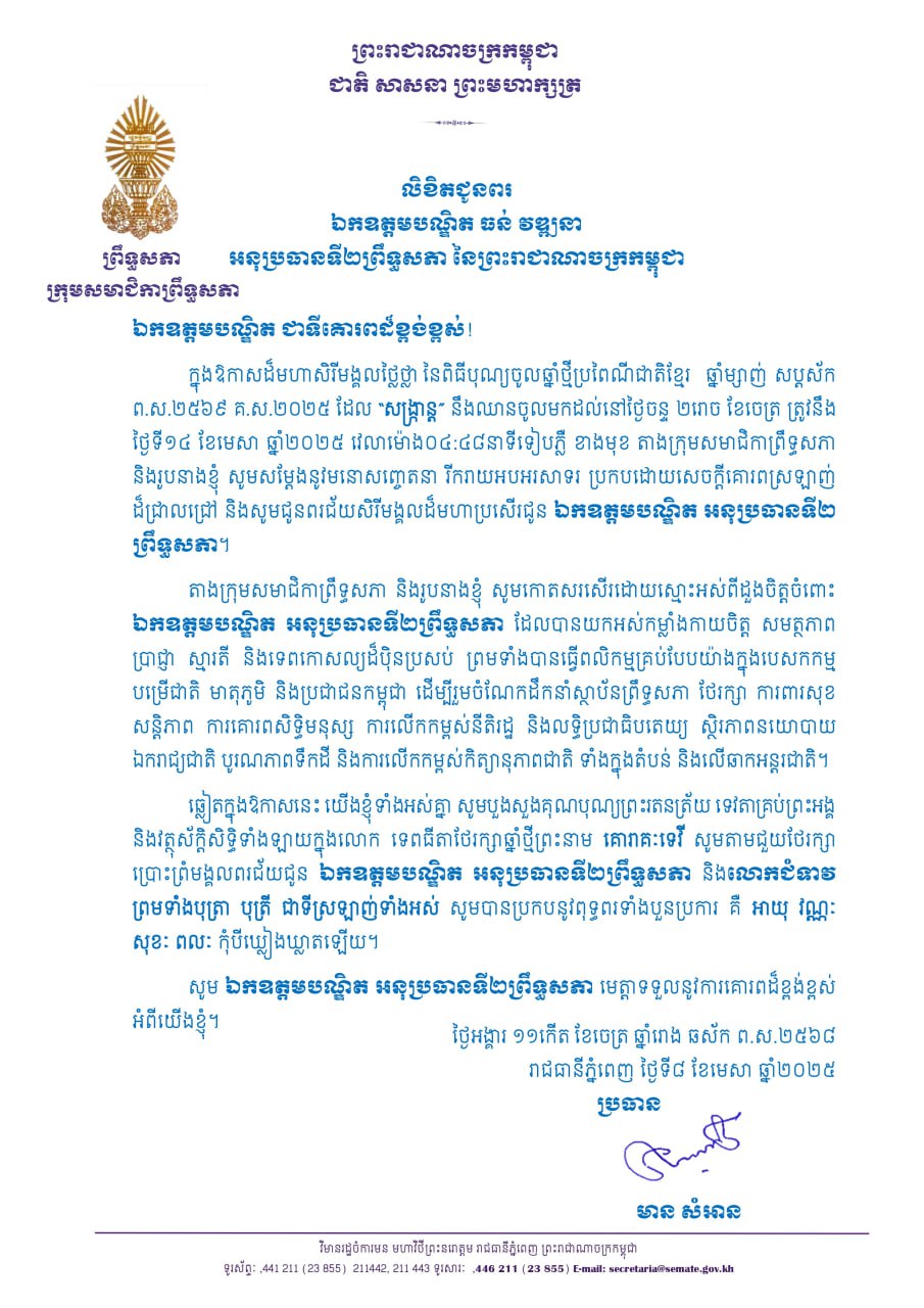 សារលិខិតជូនពររបស់ឯកឧត្តម ឡាយ សំកុល អគ្គលេខាធិការព្រឹទ្ធសភា គោរពជូន សម្តេចកិត្តិព្រឹទ្ធបណ្ឌិត ប៊ុន រ៉ានី ហ៊ុន សែន ប្រធានកាកបាទក្រហមកម្ពុជា ក្នុងឱកាសដ៏ឧត្តុង្គឧត្តមប្រកបដោយក្តីសោមនស្សរីករាយ នៃពិធីចម្រើនជន្មាយុរបស់ សម្តេចកិត្តិព្រឹទ្ធបណ្ឌិត ដែលនឹងប្រព្រឹត្តទៅនៅថ្ងៃទី១៥ ខែធ្នូ ឆ្នាំ២០២៥ ខាងមុខនេះ