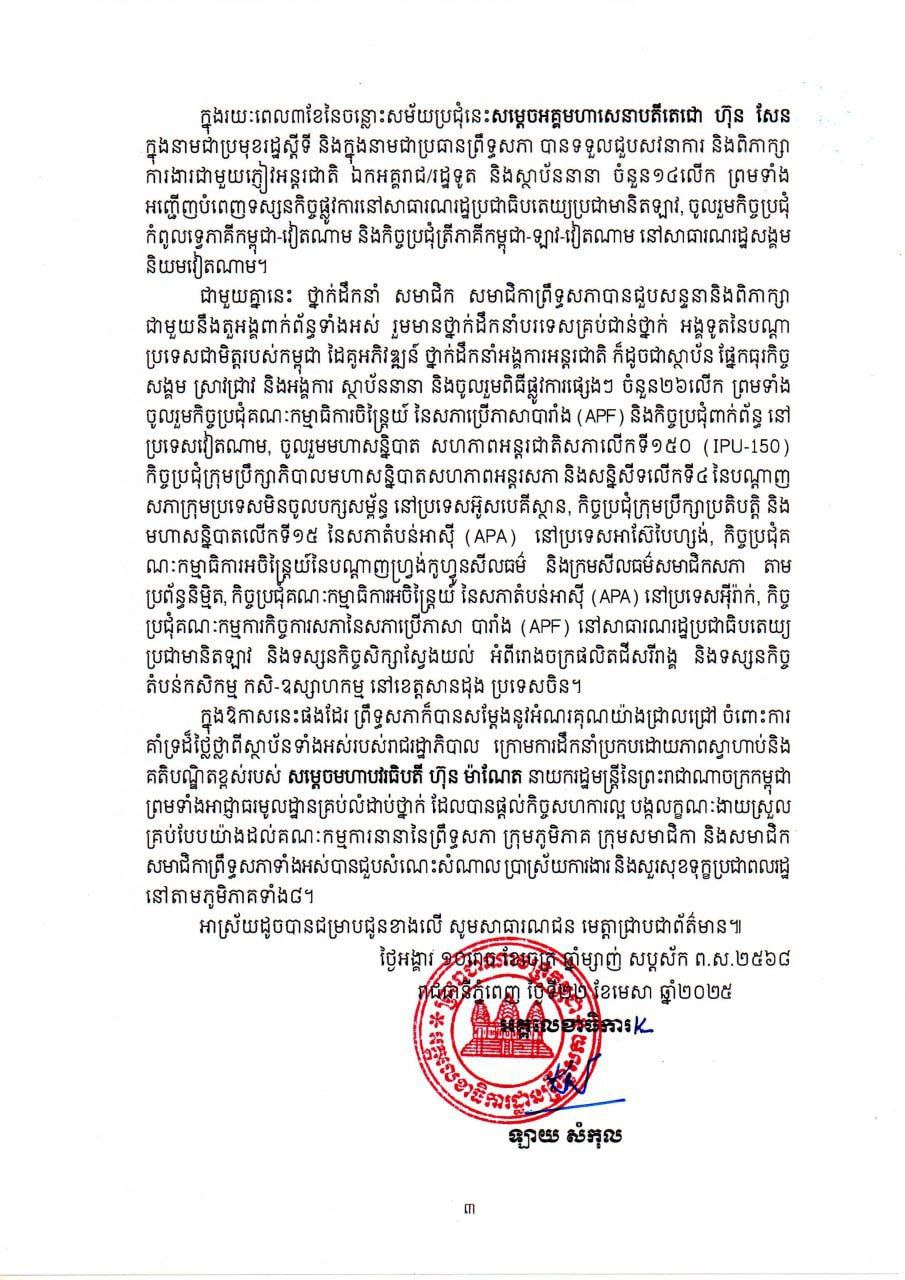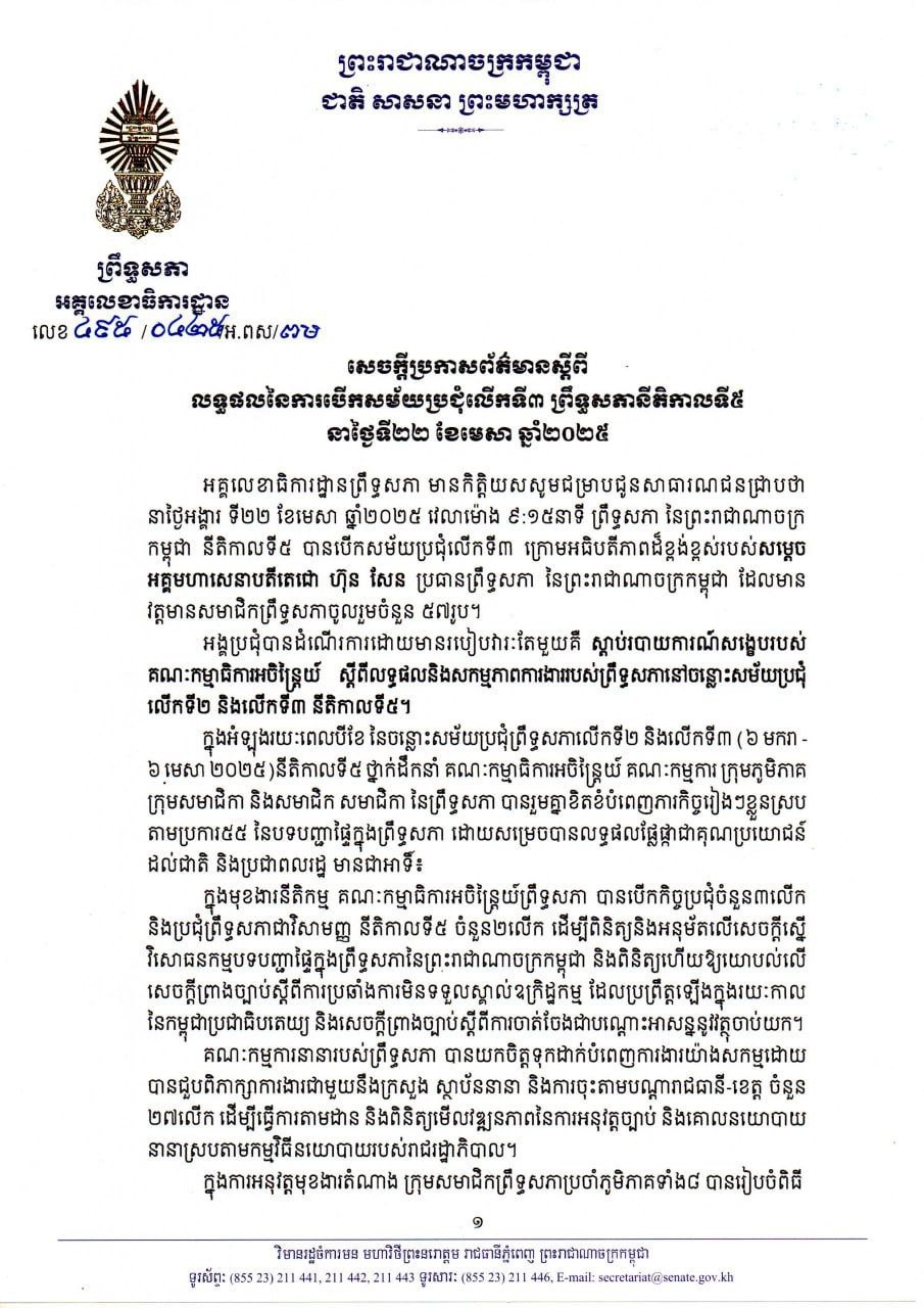 • សេចក្តីប្រកាសព័ត៌មាន ស្តីពី លទ្ធផលនៃការបើកសម័យប្រជុំលើកទី៣ ព្រឹទ្ធសភា នីតិកាលទី៥ នាថ្ងៃទី២២ ខែមេសា ឆ្នាំ២០២៥
