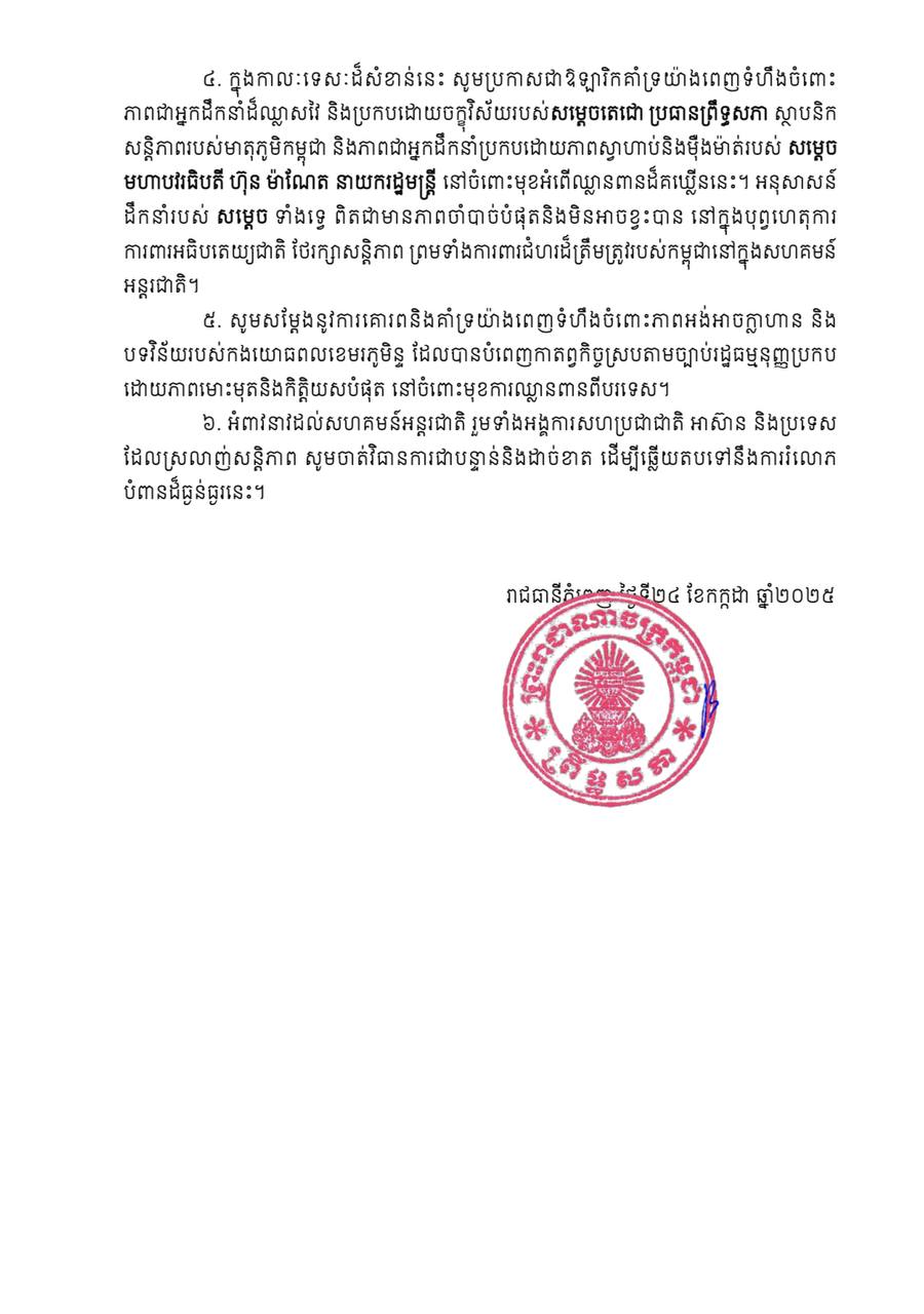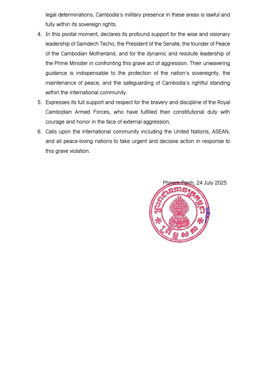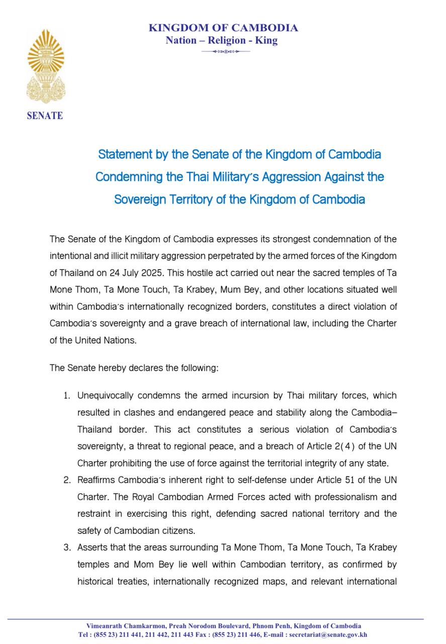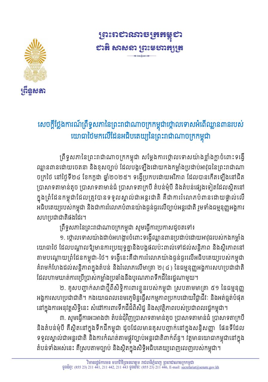 សេចក្តីថ្លែងការណ៍របស់ព្រឹទ្ធសភានៃព្រះរាជាណាចក្រកម្ពុជា ថ្កោលទោសអំពើឈ្លានពានរបស់យោធាថៃមកលើដែនអធិបតេយ្យនៃព្រះរាជាណាចក្រកម្ពុជា