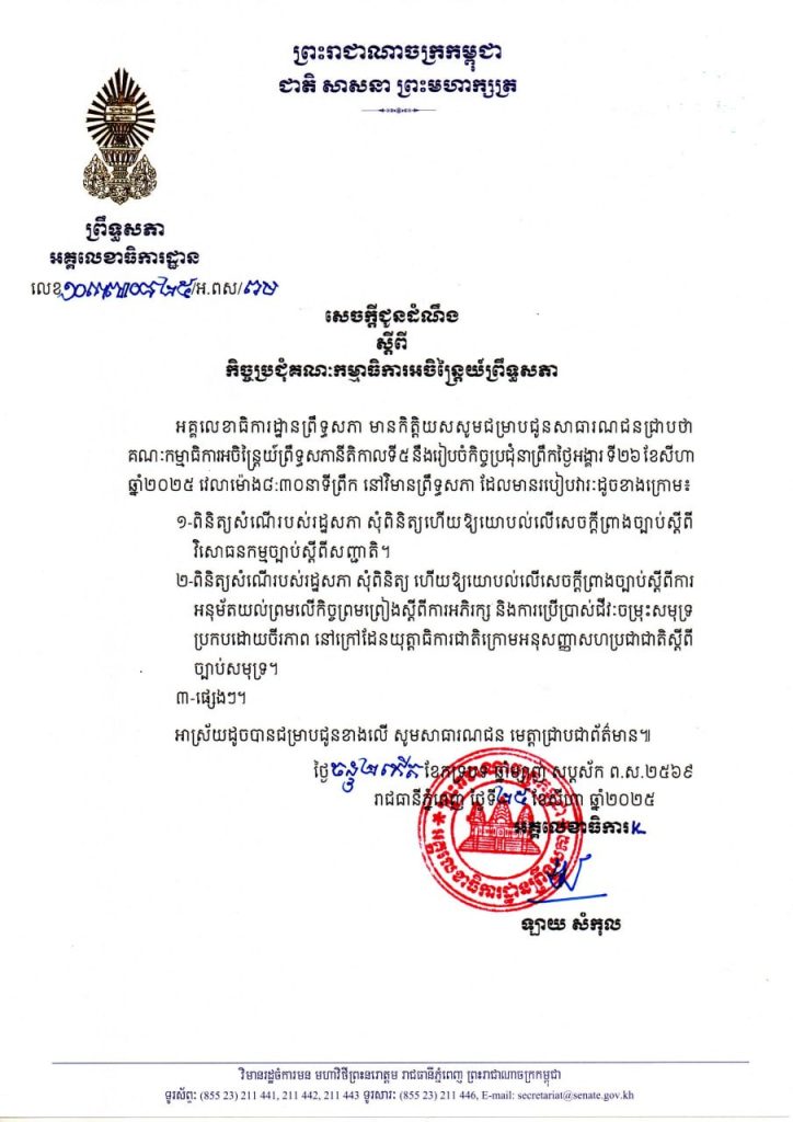 • សេចក្តីជូនដំណឹងស្តីពី កិច្ចប្រជុំគណៈកម្មាធិការអចិន្រ្តៃយ៍ព្រឹទ្ធសភា ​នីតិកាលទី៥ នាព្រឹកថ្ងៃទី២៦ ខែសីហា ឆ្នាំ២០២៥