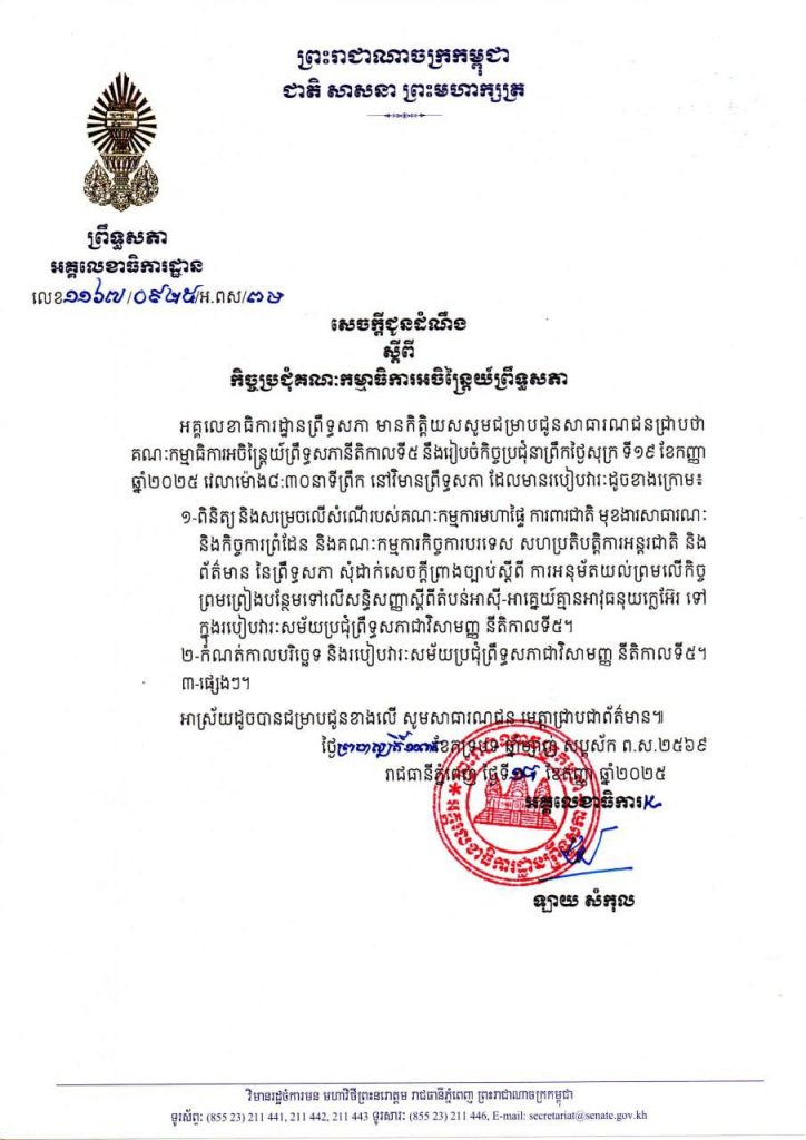 • សេចក្តីជូនដំណឹងស្តីពី កិច្ចប្រជុំគណៈកម្មាធិការអចិន្រ្តៃយ៍ព្រឹទ្ធសភា នីតិកាលទី៥ នាព្រឹកថ្ងៃទី១៩ ខែកញ្ញា ឆ្នាំ២០២៥