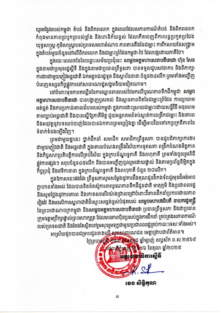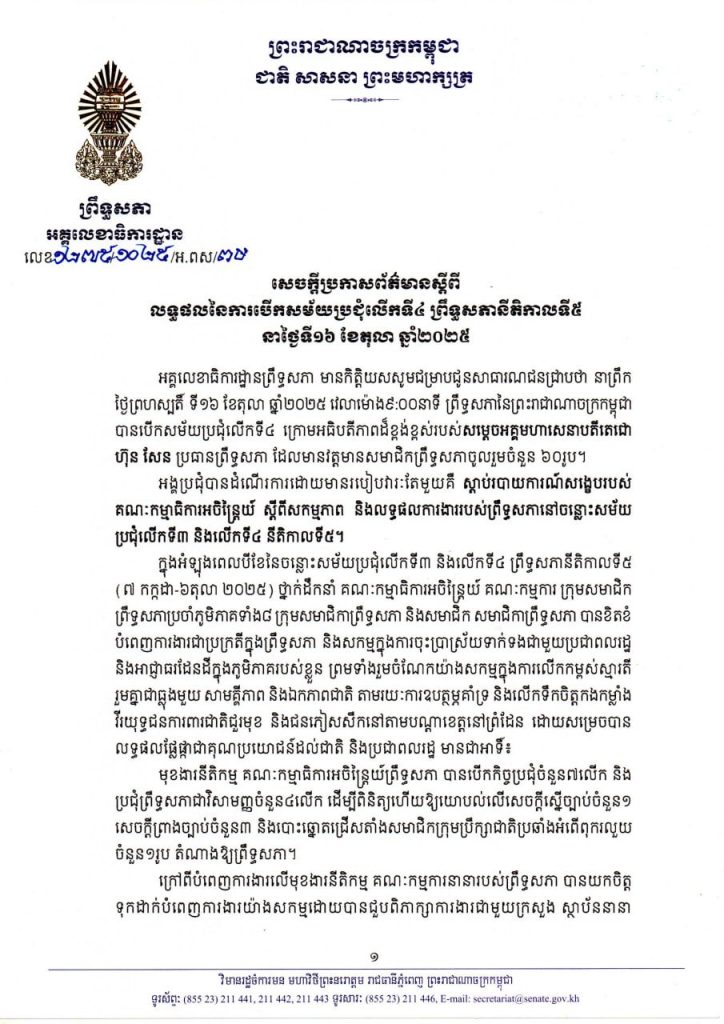 សេចក្តីប្រកាសព័ត៌មានស្តីពី លទ្ធផលនៃការបើកសម័យប្រជុំលើកទី៤ ព្រឹទ្ធសភានីតិកាលទី៥ នាថ្ងៃទី១៦ ខែតុលា ឆ្នាំ២០២៥
