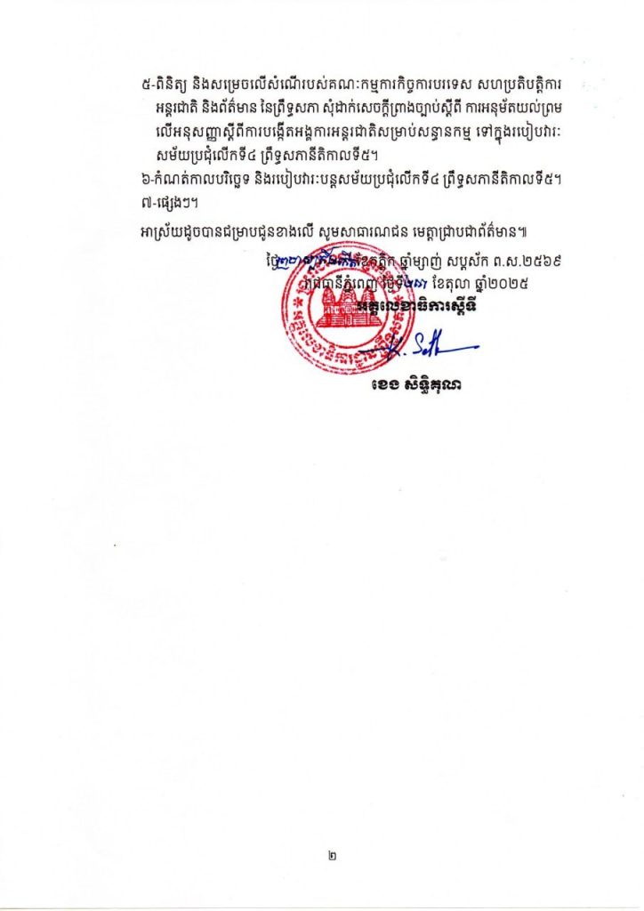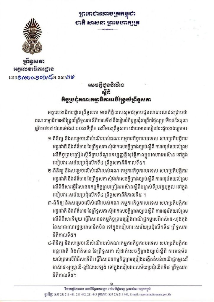 សេចក្តីជូនដំណឹងស្តីពី កិច្ចប្រជុំគណៈកម្មាធិការអចិន្រ្តៃយ៍ព្រឹទ្ធសភា នីតិកាលទី៥ នាព្រឹកថ្ងៃទី២៤ ខែតុលា ឆ្នាំ២០២៥