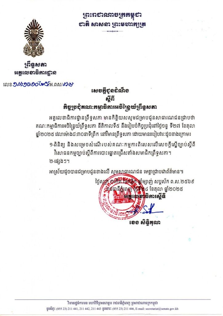 សេចក្តីជូនដំណឹងស្តីពី កិច្ចប្រជុំគណៈកម្មាធិការអចិន្រ្តៃយ៍ព្រឹទ្ធសភា នីតិកាលទី៥ នាព្រឹកថ្ងៃទី២៧ ខែតុលា ឆ្នាំ២០២៥