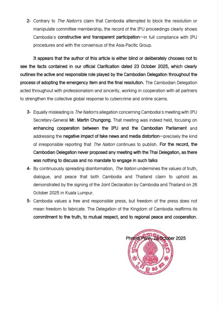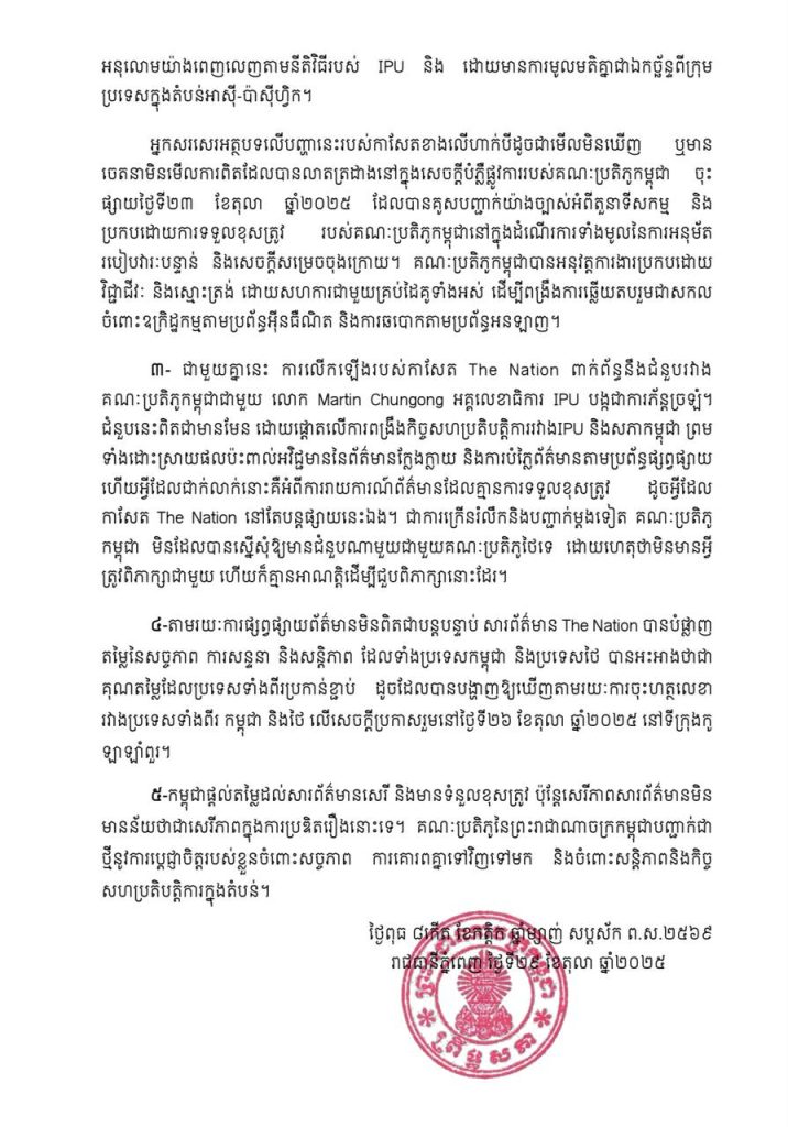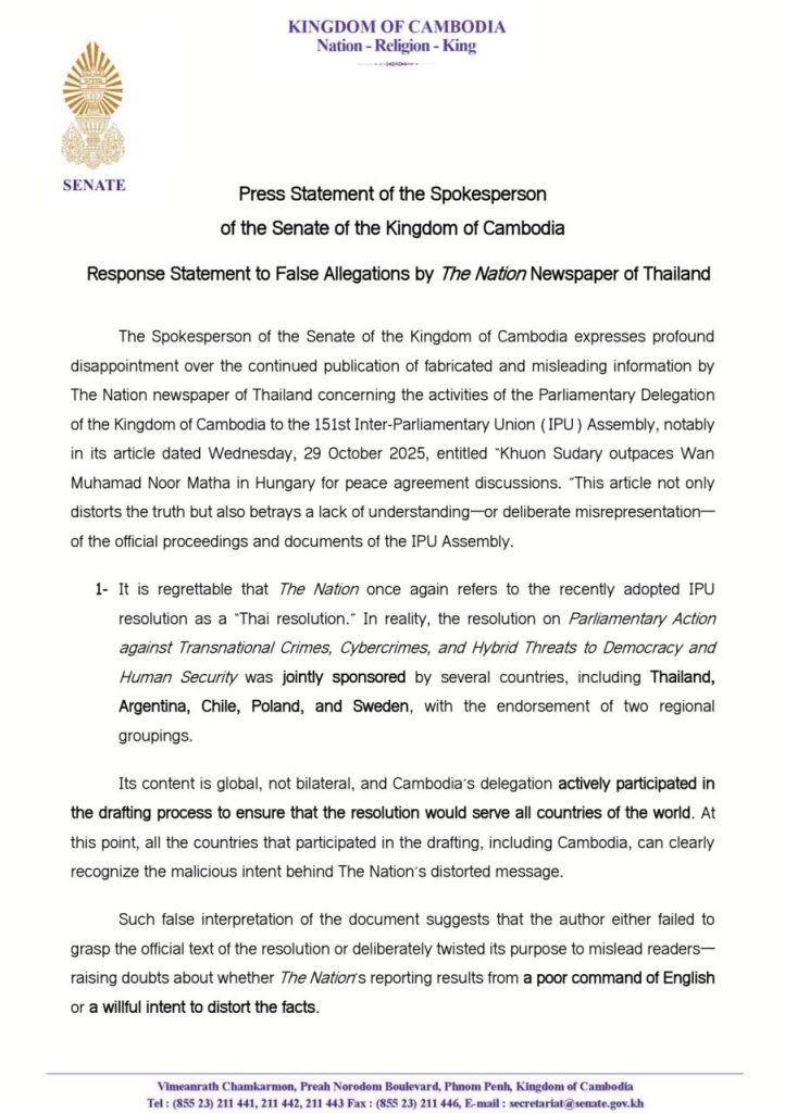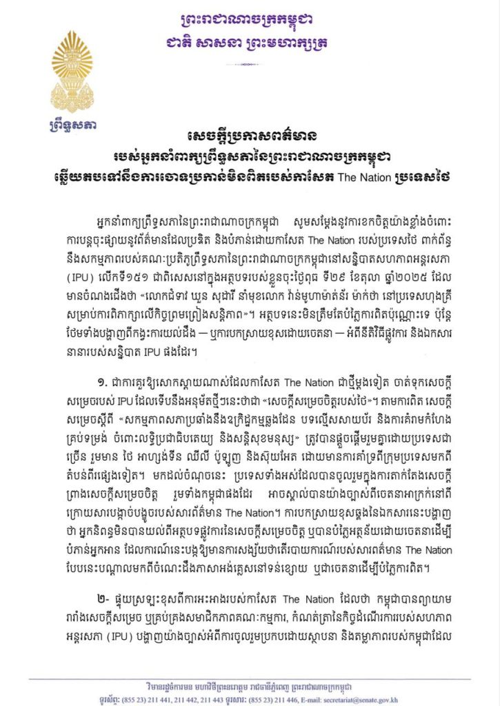 សេចក្តីប្រកាសពត៌មានរបស់អ្នកនាំពាក្យព្រឹទ្ធសភានៃព្រះរាជាណាចក្រកម្ពុជា ឆ្លើយតបទៅនឹងការចោទប្រកាន់មិនពិតរបស់កាសែត The Nation ប្រទេសថៃ ពាក់ព័ន្ធនឹងសកម្មភាពរបស់គណៈប្រតិភូព្រឹទ្ធសភានៃព្រះរាជាណាចក្រកម្ពុជា នៅសន្និបាតសហភាពអន្តរសភា (IPU) លើកទី១៥១ ជាពិសេសនៅក្នុងអត្ថបទរបស់ខ្លួនចុះថ្ងៃពុធ ទី២៩ ខែតុលា ឆ្នាំ២០២៥ ដែល មានចំណងជើងថា «លោកជំទាវ ឃួន សុដារី នាំមុខលោក វ៉ាន់មូហាម៉ាត់ន័រ ម៉ាក់ថា នៅប្រទេសហុងគ្រី សម្រាប់ការពិភាក្សាលើកិច្ចព្រមព្រៀងសន្តិភាព»