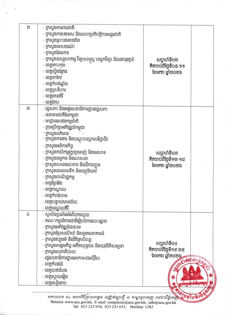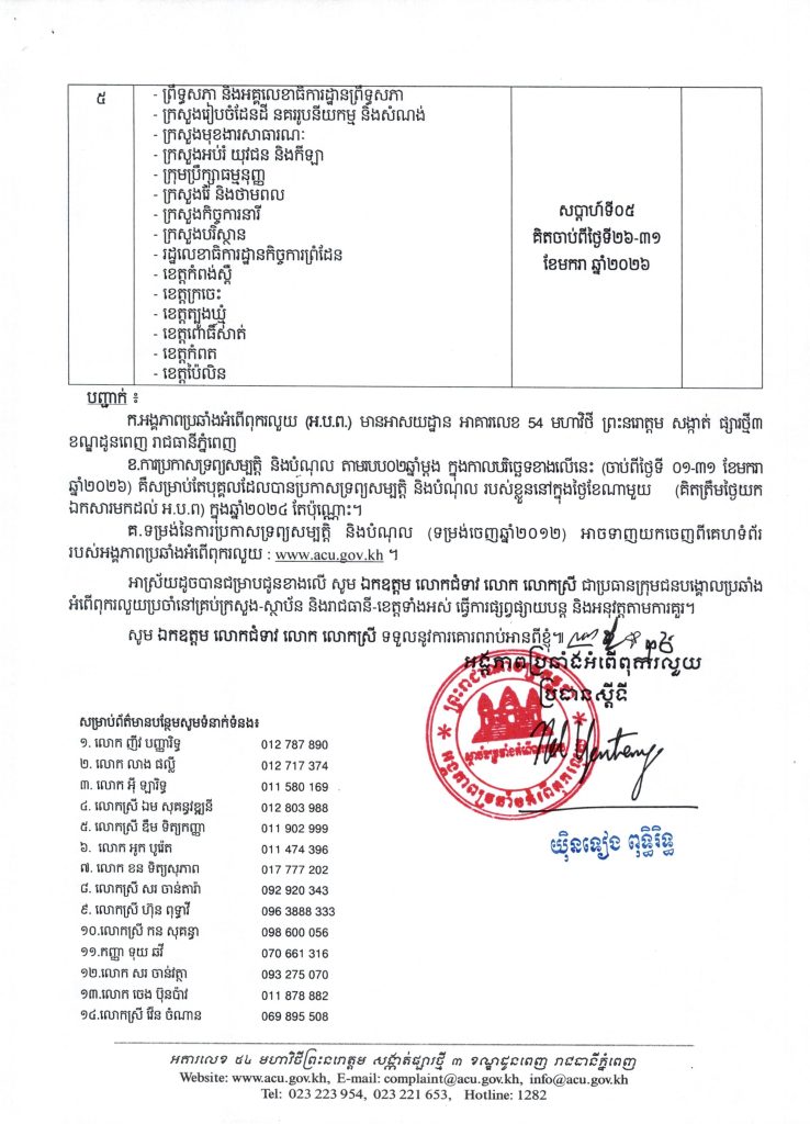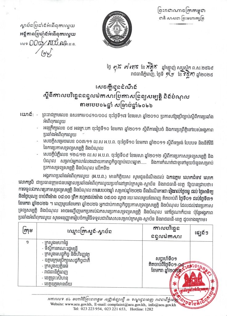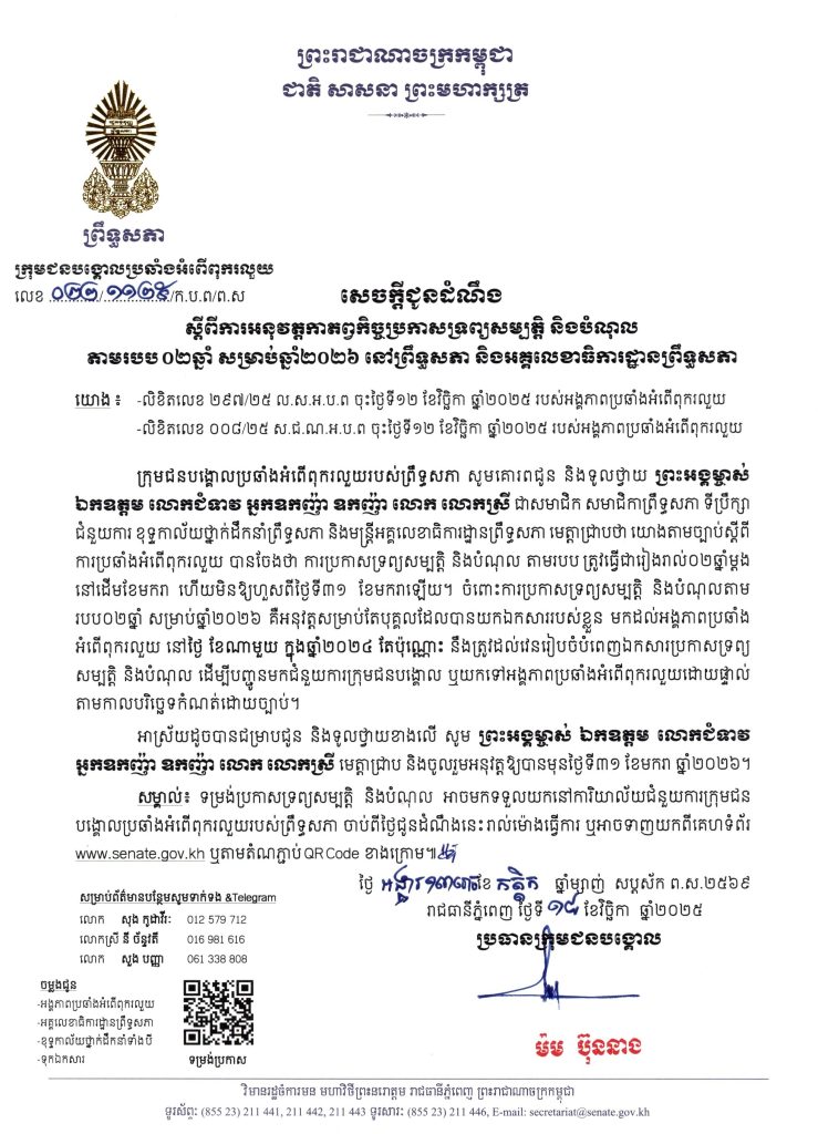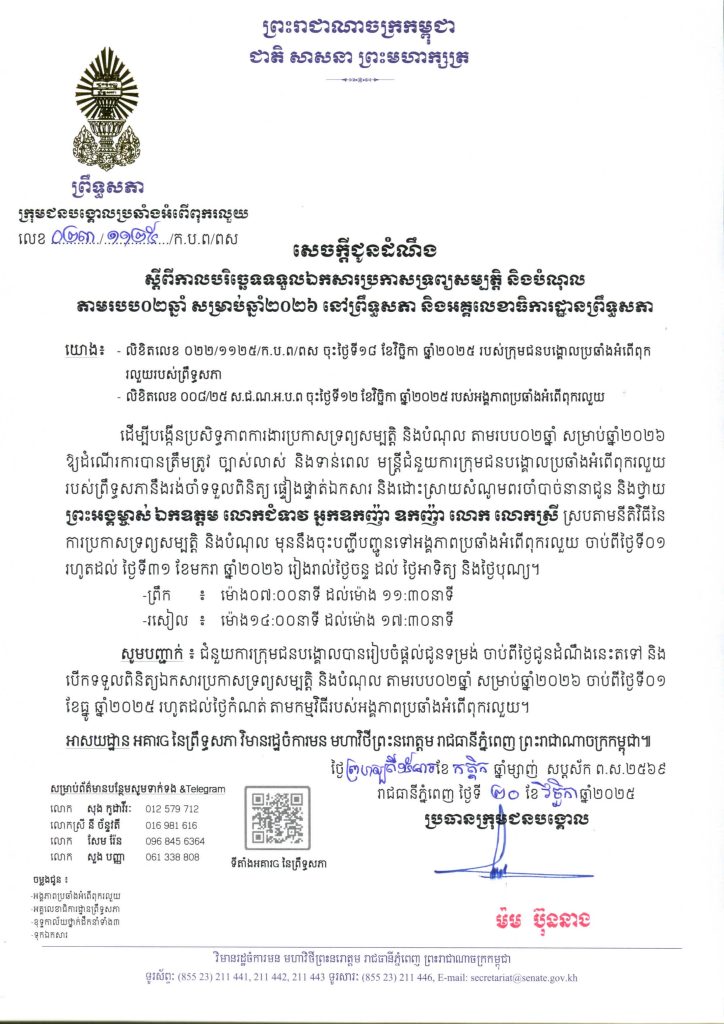 សេចក្តីជូនដំណឹង ស្តីពីកាលបរិច្ឆេទទទួលឯកសារប្រកាសទ្រព្យសម្បត្តិ និងបំណុល តាមរបប០២ឆ្នាំ សម្រាប់ឆ្នាំ២០២៦ នៅព្រឹទ្ធសភា និងអគ្គលេខាធិការដ្ឋានព្រឹទ្ធសភា