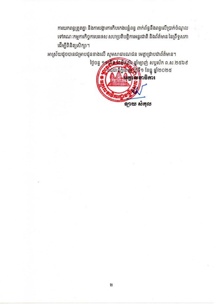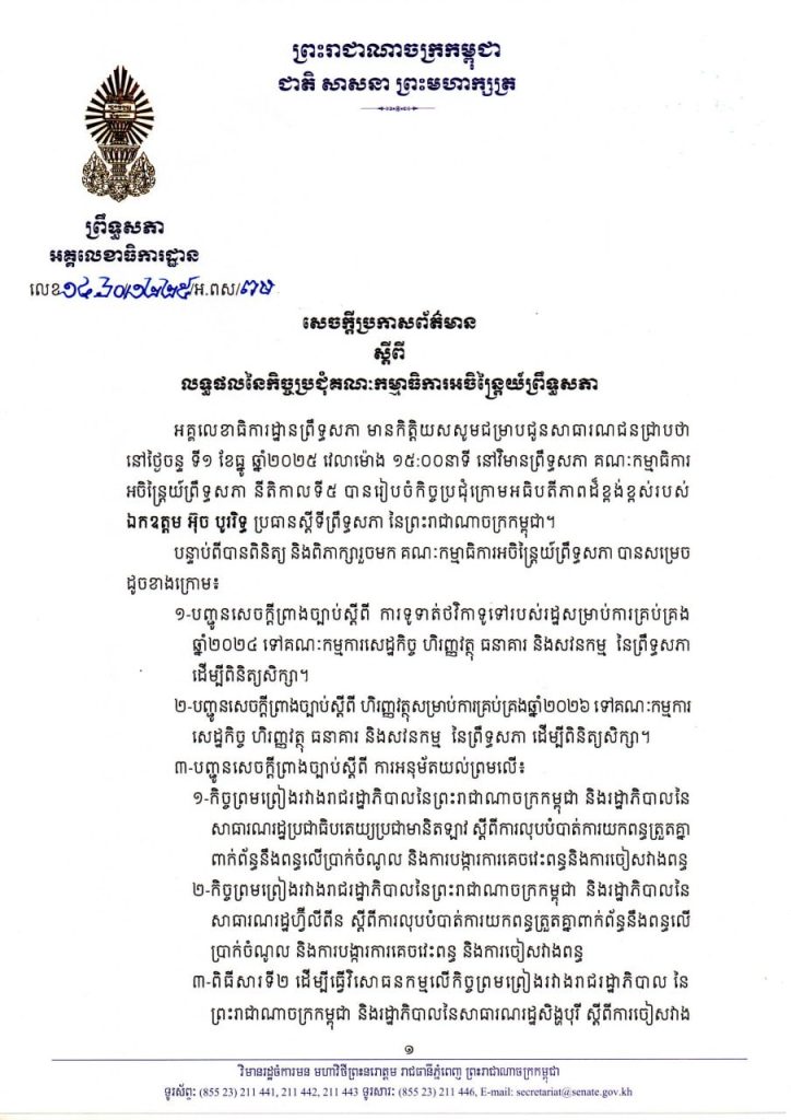 សេចក្តីប្រកាសព័ត៌មាន ស្តីពីលទ្ធផលនៃកិច្ចប្រជុំគណៈកម្មាធិការអចិន្ត្រៃយ៍ព្រឹទ្ធសភា នារសៀលថ្ងៃចន្ទ ទី១ ខែធ្នូ ឆ្នាំ២០២៥
