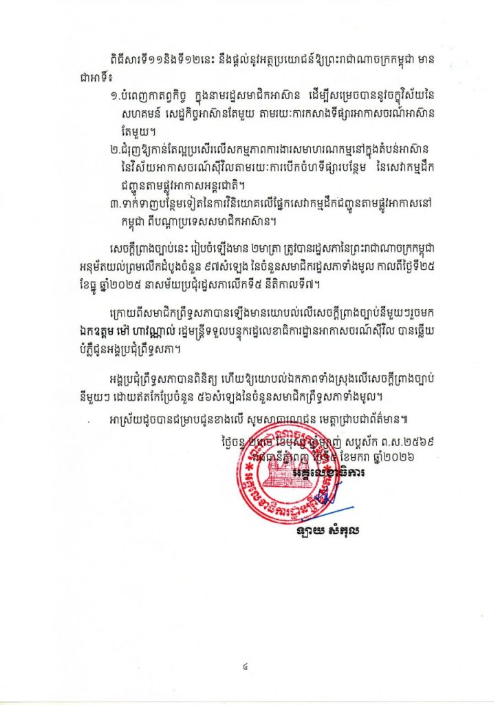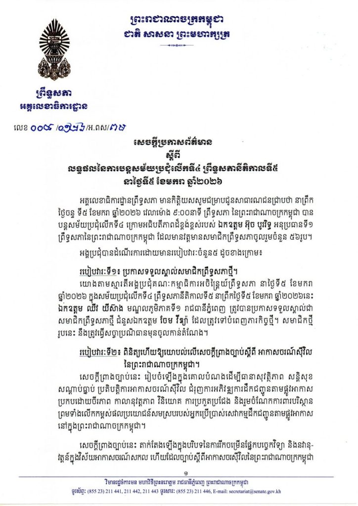 សេចក្តីប្រកាសព័ត៌មានស្តីពី លទ្ធផលនៃការបន្តសម័យប្រជុំលើកទី៤ ព្រឹទ្ធសភា នីតិកាលទី៥ នាថ្ងៃទី៥ ខែមករា ឆ្នាំ២០២៦