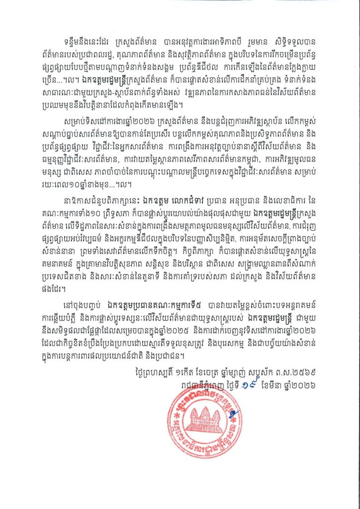 សេចក្តីប្រកាសព័ត៌មាន ស្តីពី «ជំនួបពិភាក្សាការងាររវាងឯកឧត្តមបណ្ឌិត ឈីវ យីស៊ាង ប្រធានគណៈកម្មការ កិច្ចការបរទេស សហប្រតិបត្តិការអន្តរជាតិ និងព័ត៌មាន នៃព្រឹទ្ធសភា (គណៈកម្មការទី៥) និងឯកឧត្តម នេត្រ ភក្ត្រា រដ្ឋមន្ត្រីក្រសួងព័ត៌មាន និងថ្នាក់ដឹកនាំក្រសួងព័ត៌មាន»