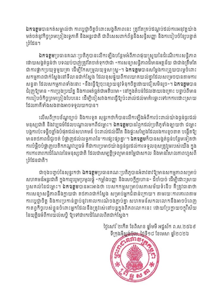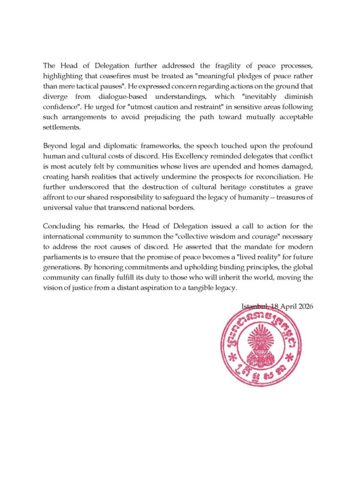 សេចក្តីប្រកាសព័ត៌មានស្តីពី ឯកឧត្តម អ៊ុច បូររិទ្ធ អនុប្រធានទី១ព្រឹទ្ធសភា៖ «សន្តិភាពយូរអង្វែងអាចរីកចម្រើនទៅបាន លុះត្រាតែមាន ការប្តេជ្ញាចិត្តឥតងាករេ ចំពោះសច្ចធម៌ យុត្តិធម៌ និងនីតិរដ្ឋមិនលម្អៀង» ថ្លែងក្នុងកិច្ចពិភាក្សាទូទៅនៃមហាសន្និបាត លើកទី១៥២ របស់សហភាពអន្តរសភា (IPU) នៅទីក្រុងស៊ីស្តង់ប៊ុល សាធារណរដ្ឋតួកគីយ៉េ ថ្ងៃទី១៧ ខែមេសា ឆ្នាំ២០២៦