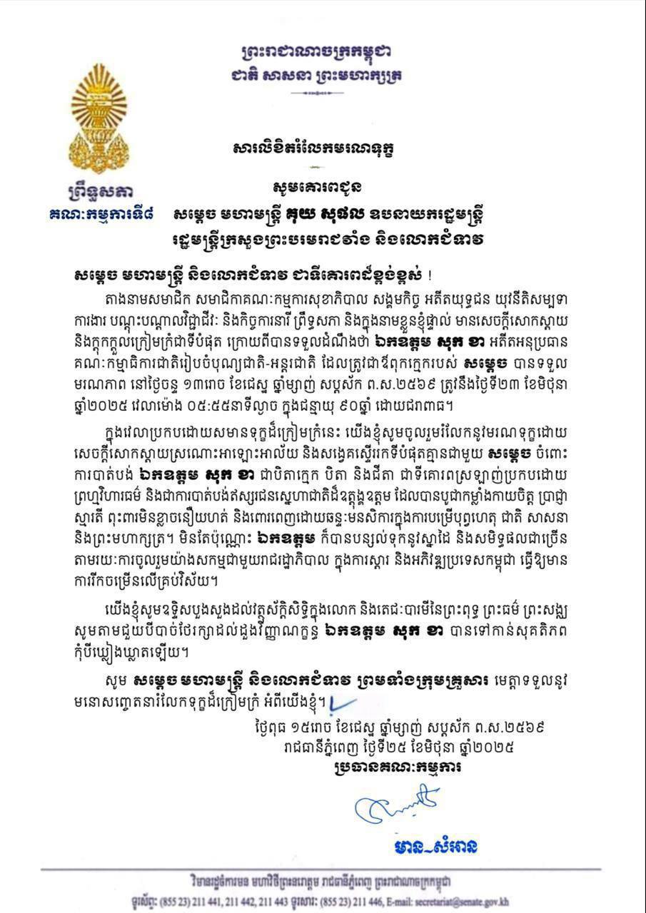 សារលិខិតរំលែកមរណទុក្ខ របស់ គណៈកម្មការទី៨ព្រឹទ្ធសភា គោរពជូនសម្តេច មហាមន្ត្រី គុយ សុផល ឧបនាយករដ្ឋមន្ត្រី រដ្ឋមន្ត្រីក្រសួងព្រះបរមរាជវាំង និងលោកជំទាវ ចំពោះមរណភាពរបស់ឯកឧត្តម សុក ខា ដែលត្រូវជាឪពុកក្មេករបស់ សម្តេច និងជាអតីតអនុប្រធានគណៈកម្មាធិការជាតិរៀបចំ បុណ្យជាតិ-អន្តរជាតិ បានទទួលមរណភាពនៅថ្ងៃចន្ទ ទី២៣ ខែមិថុនា ឆ្នាំ២០២៥ វេលាម៉ោង ០៥:៥៥នាទីល្ងាច ក្នុងជន្មាយុ ៩០ឆ្នាំ ដោយជរាពាធ