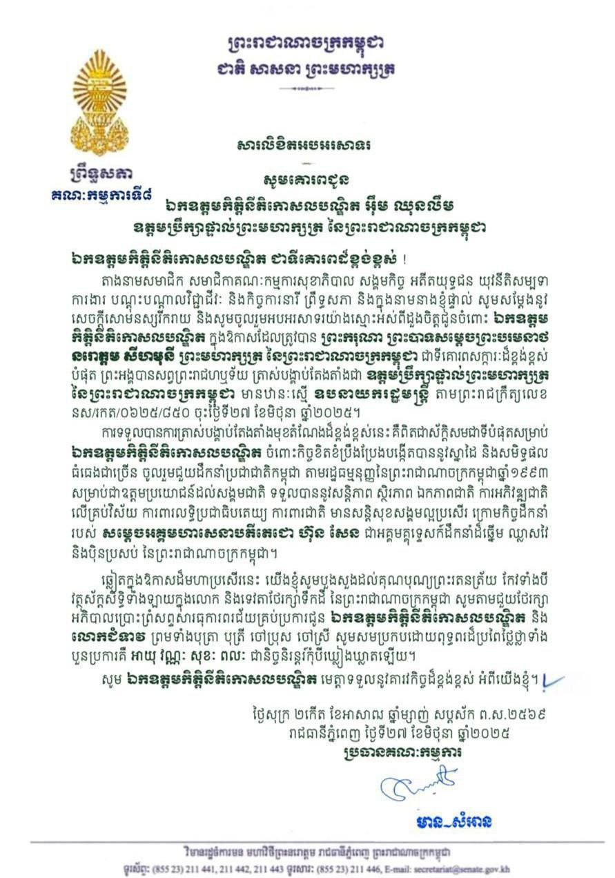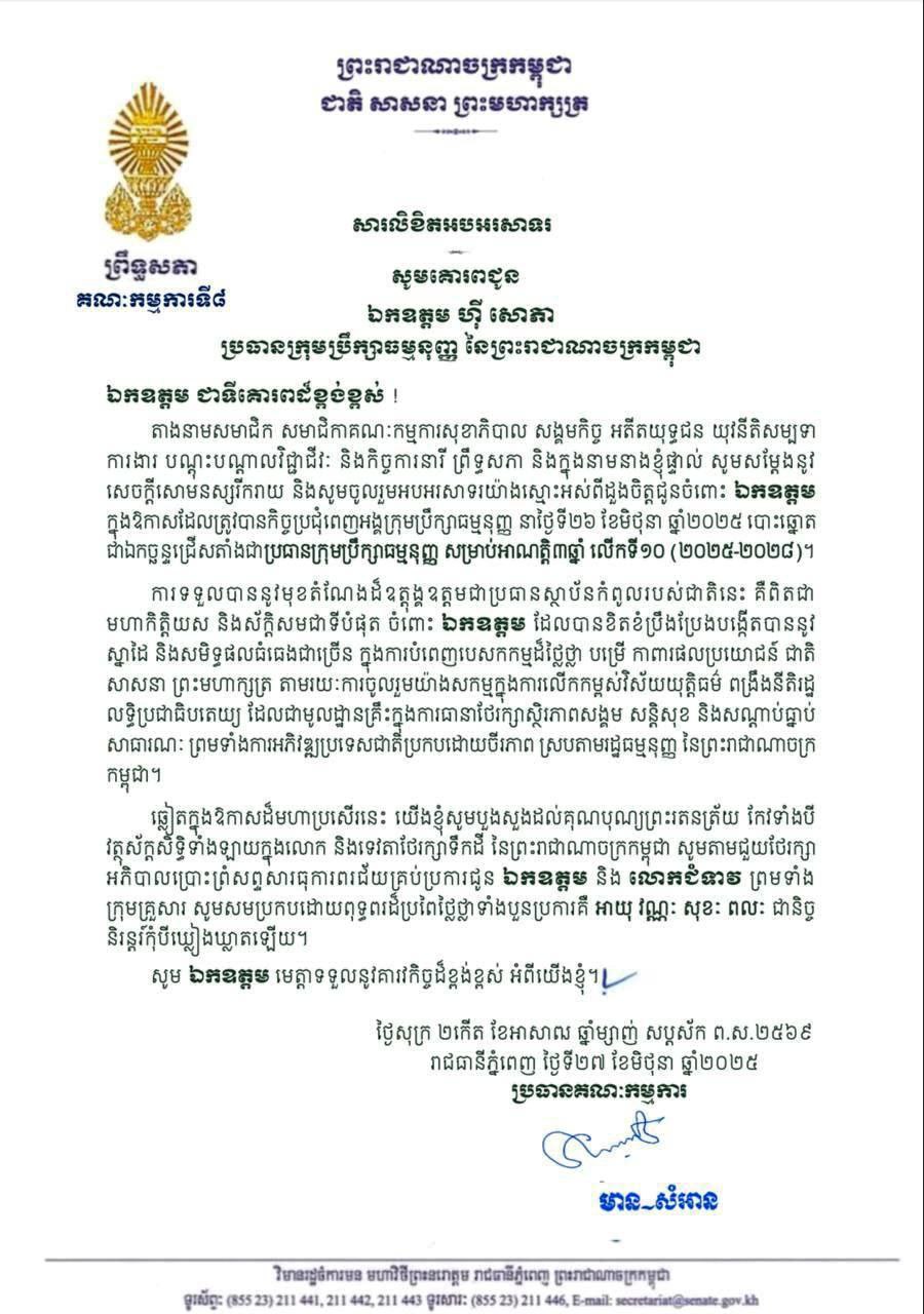 សារលិខិតអបអរសាទររបស់លោកជំទាវ មាន សំអាន ប្រធានគណៈកម្មការទី៨ព្រឹទ្ធសភា គោរពជូនឯកឧត្តម ហ៊ី សោភា ក្នុងឱកាសដែលត្រូវបានកិច្ចប្រជុំពេញអង្គក្រុមប្រឹក្សាធម្មនុញ្ញបោះឆ្នោត ជាឯកច្ឆន្ទជ្រើសតាំងជាប្រធានក្រុមប្រឹក្សាធម្មនុញ្ញ សម្រាប់អាណត្តិ៣ឆ្នាំ លើកទី១០ (២០២៥-២០២៨)