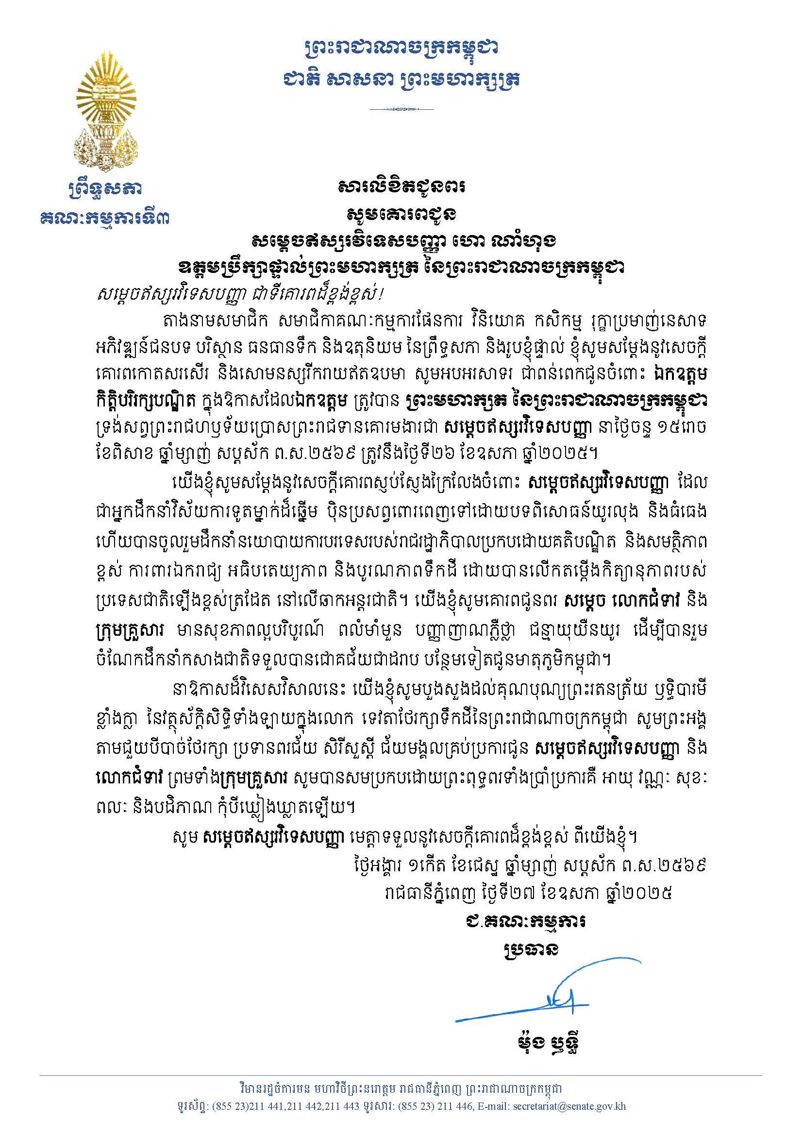 សារលិខិតអបអរសាទរ របស់ គណៈកម្មការទី៣ ព្រឹទ្ធសភា សូមគោរពជូន សម្តេច ឥស្សរវិទេសបញ្ញា ហោ ណាំហុង ឧត្តមប្រឹក្សាផ្ទាល់ព្រះមហាក្សត្រ នៃព្រះរាជាណាចក្រកម្ពុជា