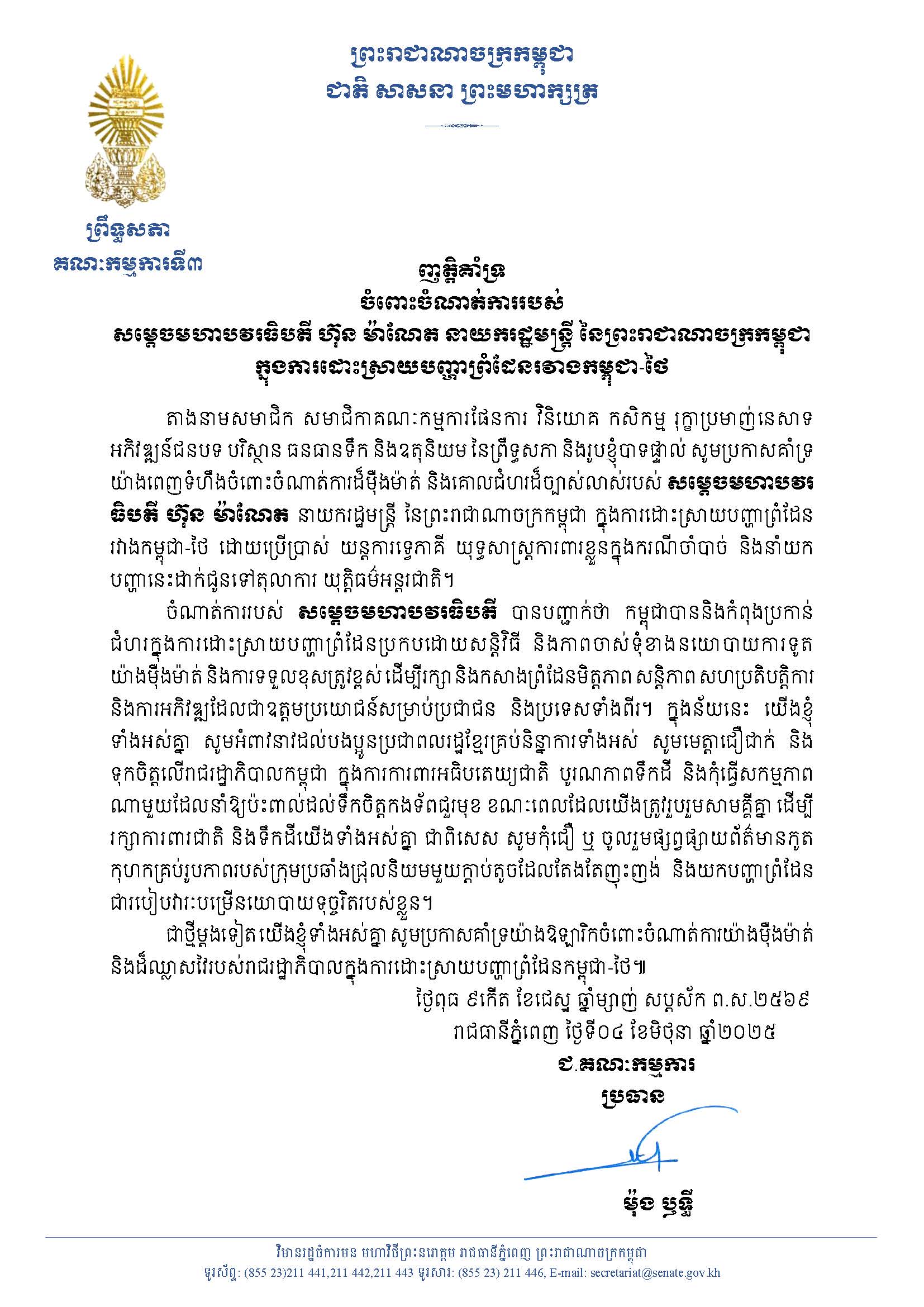 ញត្តិគាំទ្រ របស់ គណៈកម្មការទី៣ព្រឹទ្ធសភា ចំពោះចំណាត់ការរបស់ សម្តេចមហាបវរធិបតី ហ៊ុន ម៉ាណែត នាយករដ្ឋមន្ត្រី នៃព្រះរាជាណាចក្រកម្ពុជា ក្នុងការដោះស្រាយបញ្ហាព្រំដែនរវាងកម្ពុជា-ថៃ