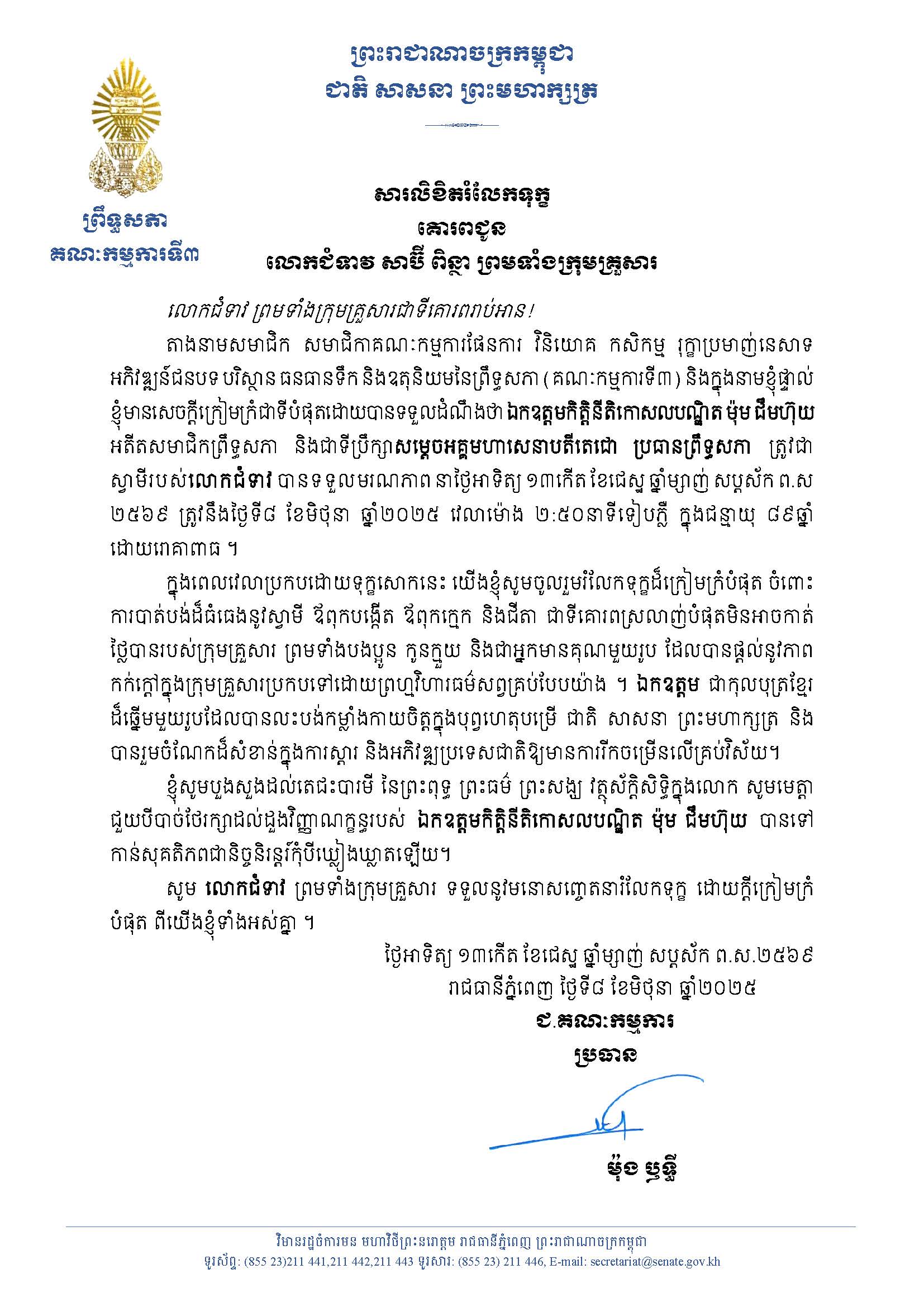 សារលិខិតរំលែកទុក្ខរបស់ប្រធានគណៈកម្មការទី៣ព្រឹទ្ធសភា គោរពជូនលោកជំទាវ សាប៊ី ពិន្ថា ព្រមទាំងក្រុមគ្រួសារ ចំពោះមរណភាពរបស់ឯកឧត្តមកិត្តិនីតិកោសលបណ្ឌិត ម៉ុម ជឹមហ៊ុយ អតីតសមាជិកព្រឹទ្ធសភា និងជាទីប្រឹក្សាសម្តេចអគ្គមហាសេនាបតីតេជោ ហ៊ុន សែន ប្រធានព្រឹទ្ធសភា នៃព្រះរាជាណាចក្រកម្ពុជា ដែលបានទទួលមរណភាពនៅថ្ងៃអាទិត្យ ទី៨ ខែមិថុនា ឆ្នាំ២០២៥ វេលាម៉ោង ២:៥០នាទីទៀបភ្លឺ ក្នុងជន្មាយុ ៨៩ឆ្នាំ ដោយរោគាពាធ